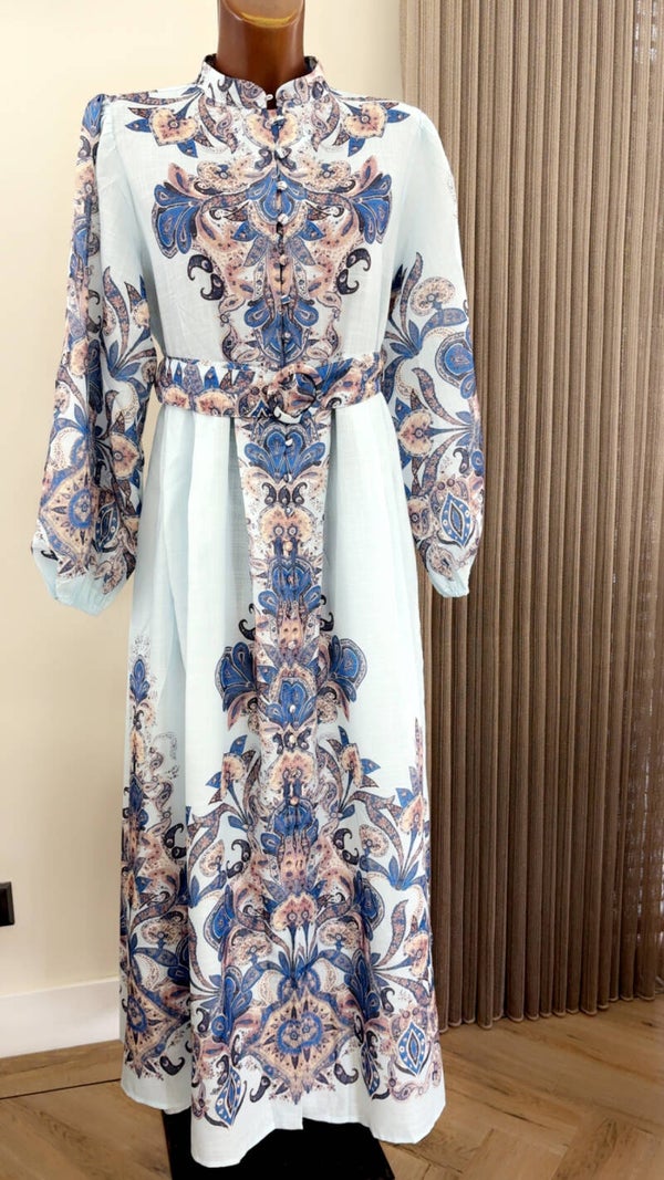 SUMMER// Jurk volledig bewerkt met de kleuren blauw en bruin. Jurk sluit dmv knopen aan de voorzijde. Jurk heeft ook steekzakken.