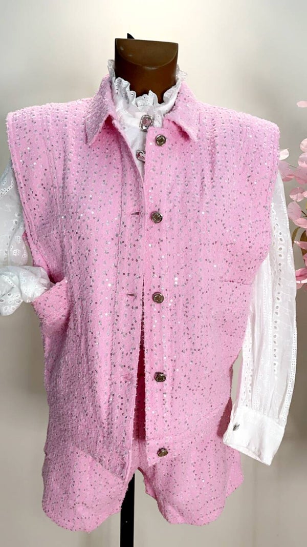 SUMMER// PINK pailletten short van AMBIKA met elastische band. Wij hebben een bijpassende gilet en jacket in het roze, lila en blauw.