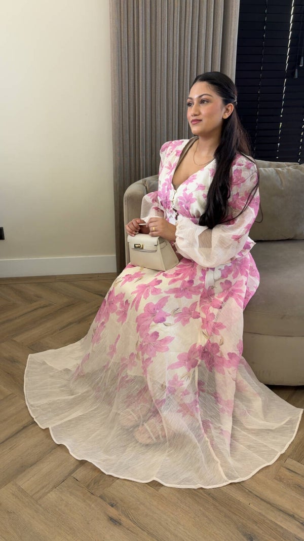 Deze elegante straalt pure romantiek uit met haar zachte, semi-transparante stof en prachtige roze bloemenprint. Het ontwerp heeft een flatterende V-hals, lange lichtpofmouwen en een knoopsluiting aan de voorzijde met verfijnde parelknopen. De subtiele taille-accentuering en lichte peplum geven een sierlijk silhouet, terwijl de soepele rok zorgt voor een luchtige en vrouwelijke uitstraling.