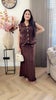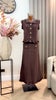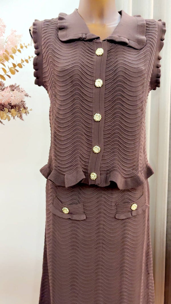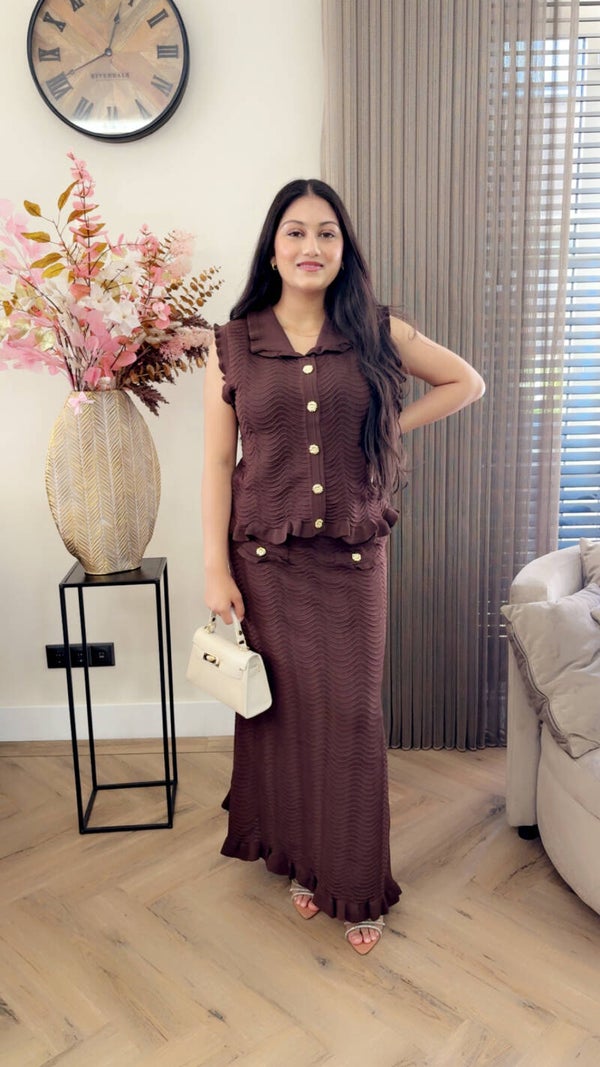CLASSY//Bruine two-piece set combineert klasse en comfort in één look. Het mouwloze topje met goudkleurige druk knopen en speelse ruches aan de kraag en taille zorgt voor een verfijnde uitstraling. De bijpassende maxi-rok met dezelfde subtiele golvende textuur en ruches langs de zoom geeft het geheel een vrouwelijke en chique touch. Perfect voor speciale gelegenheden of een stijlvolle daglook.